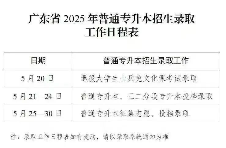 根据《关于做好广东省 2025 年普通高等学校专升本招生录取工作的通知》(粤招办普〔2025〕21 号)文件要求及录取工作日程安排,我校普通专升本退役大学生士兵批录取工作已结束,录取结果可在我校招生网及招生办微信公众号查询。