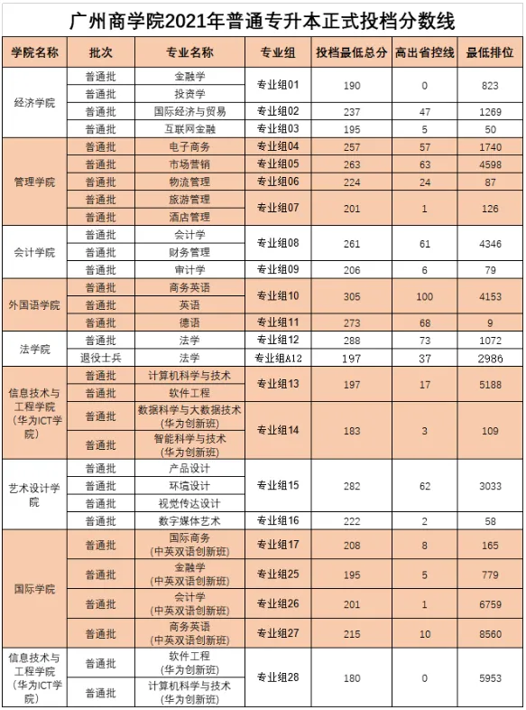 2021年-2024年广州商学院专升本分数线及排位汇总!