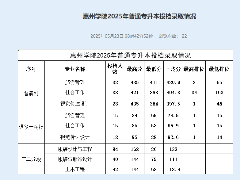 广东专插本为备考广东专插本的考生整理了惠州学院2025年普通专插本投档录取情况,更多内容详细见下。