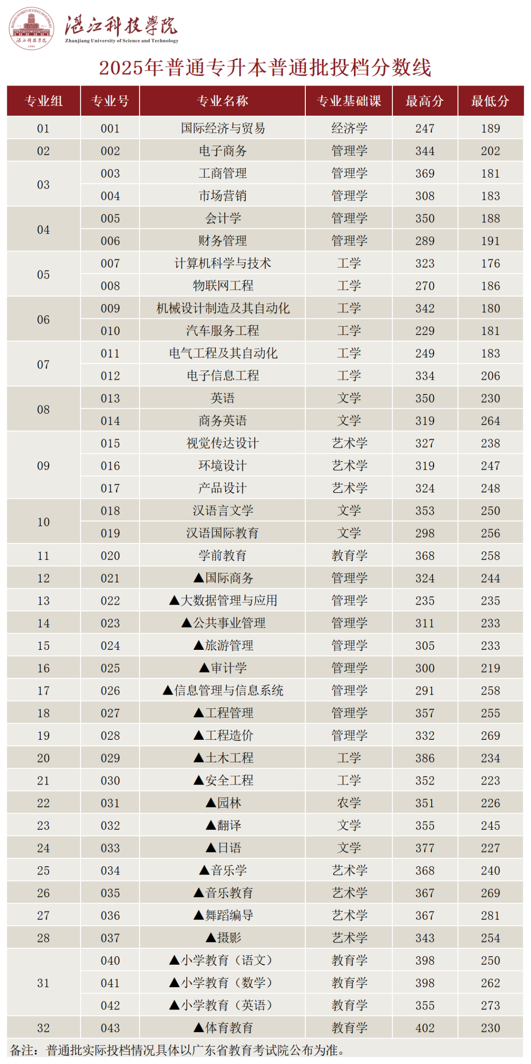 广东专插本为备考广东专插本的考生整理了湛江科技学院2025年普通专插本普通批投档分数线,更多内容详细见下。