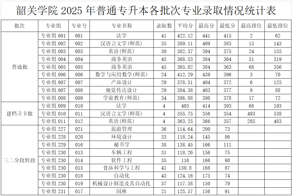 2025年韶关学院专插本各批次录取情况汇总!