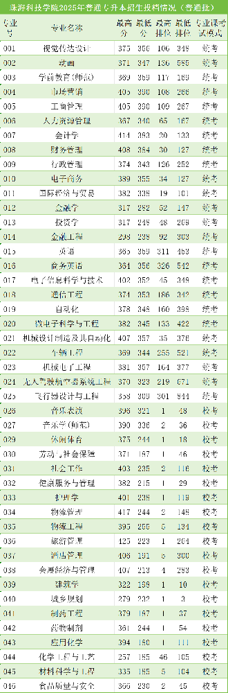 珠海科技学院2025年专插本录取最低分及排位汇总!