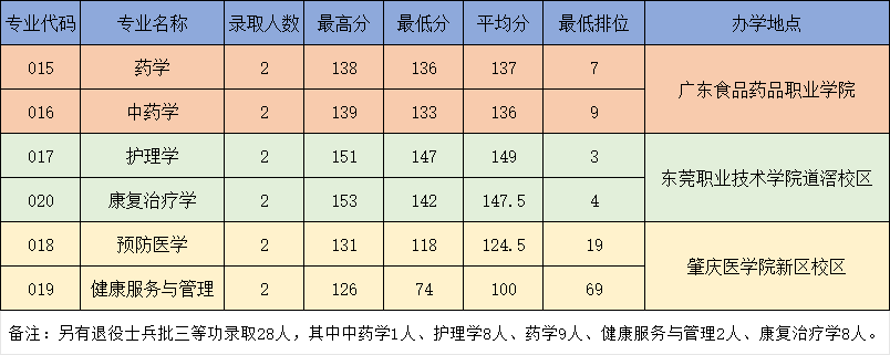 录取分数远低于普通批,如护理学 147 分、药学 133 分,且三等功考生可免试录取(如药学 9 人、护理学 8 人),退役士兵可充分利用政策优势。