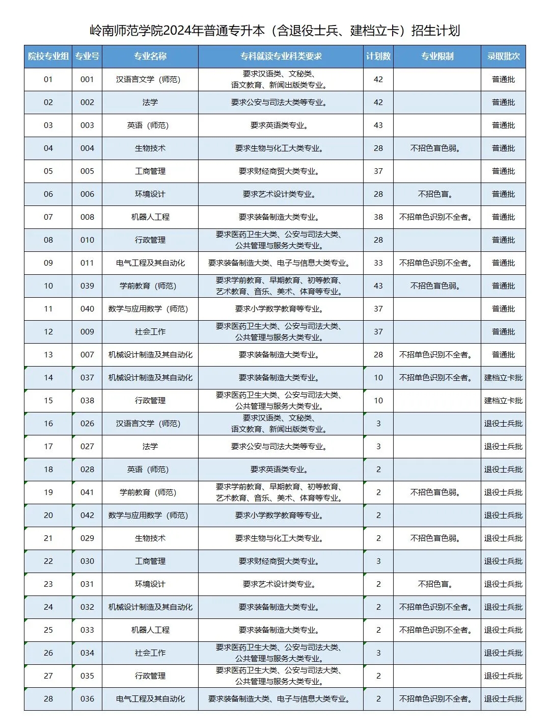 广东专插本为专插本学子整理了2024年岭南师范学院的招生计划,供大家参考!2024年岭南师范学院开设专业共20个,分为三个批次,普通批、建档立卡批、退役士兵批。普通批可报专业共13个,包括汉语言文学(师范)、法学、英语(师范)等,其中招生计划人数分别为42、42、43人等。详细内容见下表!