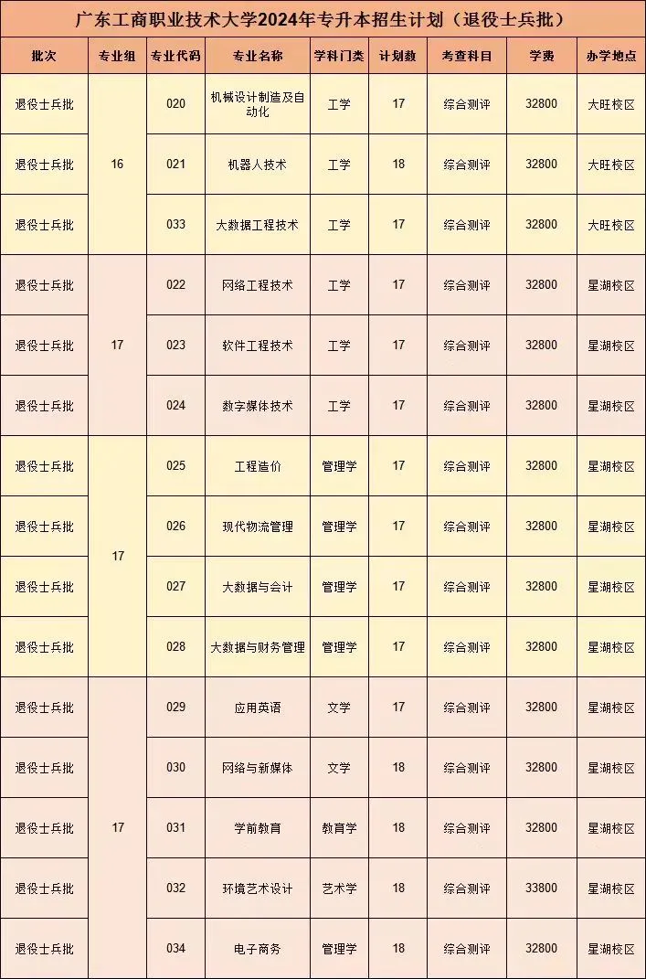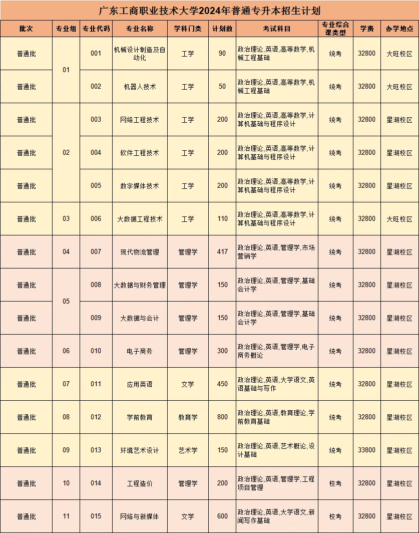 广东专插本为专插本学子整理了2024年广东工商职业技术大学的招生计划,供大家参考!2024年广东工商职业技术大学开设专业共34个,普通批可报考的专业有机械设计制造及自动化、机器人技术、网络工程技术、软件工程技术等,招生计划数分别为90、50、200、200人。详细内容见下表!