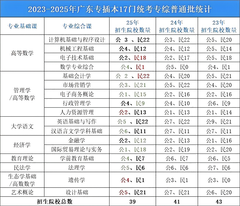 下面统计了2023-2025年专插本17门统考专业综合课对应的公办、民办院校数量: