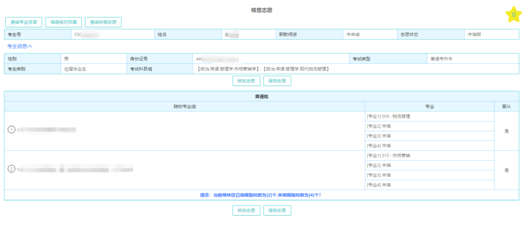 四、核查志愿有无填写错误,考生可进行保存、查看 、修改等操作