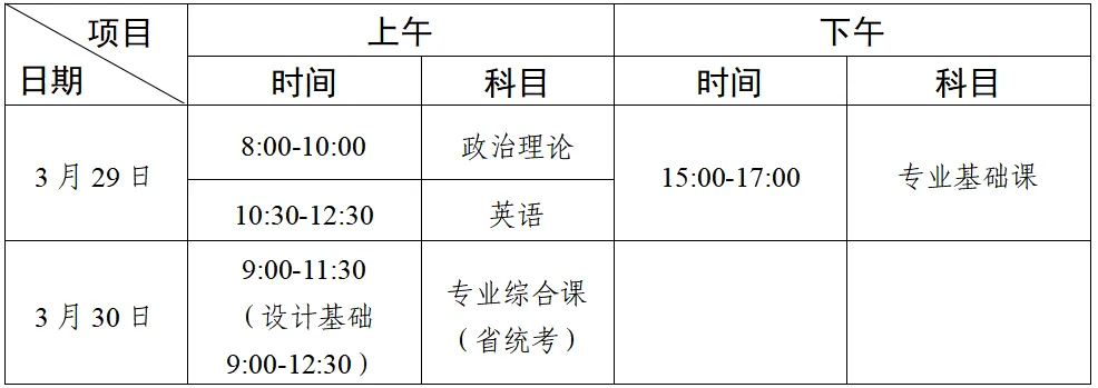 (四)普通专升本招生考试时间为2025年3月29日(星期六)至30日(星期日)两天,具体安排见下表: