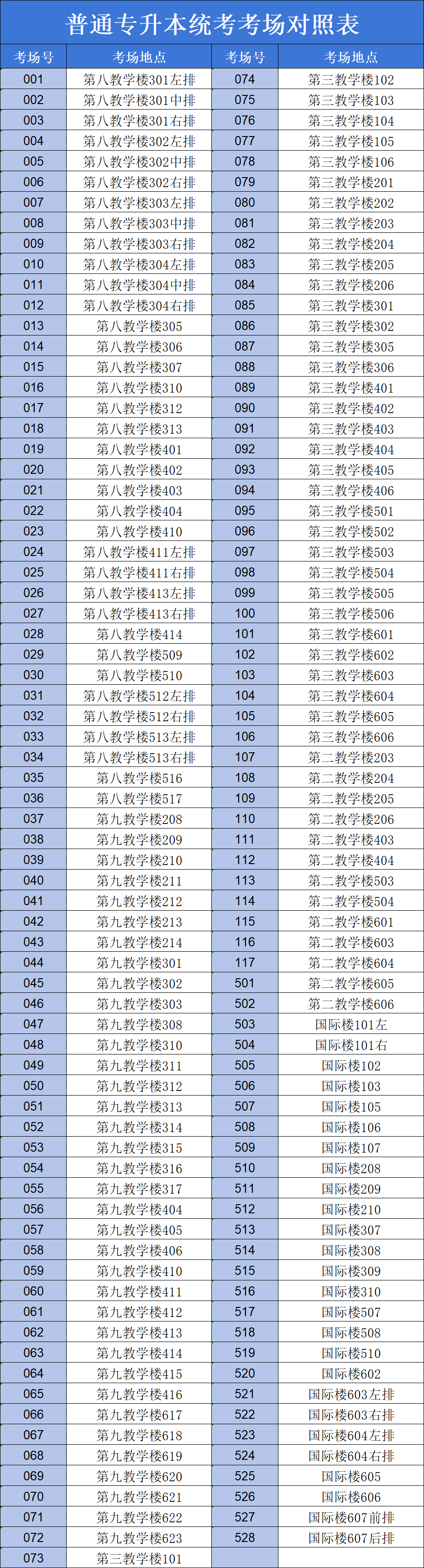 第八教学楼001-036考场,第九教学楼037-072考场,第三教学楼073-106考场,第二教学楼107-117、501、502考场,国际学院楼503-528.具体考试地点安排,请查看准考证。