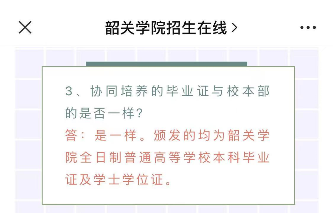 关于这个问题,韶关学院官微回复过,协同培养的毕业证和学位证与校本部的是一样的。所以大家对于这个问题可以放心。联合培养录取的学生在校学习期间,学籍管理由本科院校按照《普通高等学校学生管理规定》执行。学生按教学计划修完规定课程,成绩合格,由本科院校颁发普通高等教育本科毕业证书,符合学士学位授予条件的授予相应学士学位。