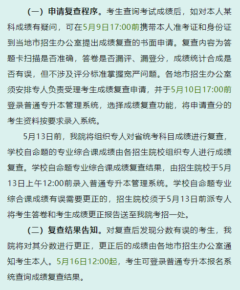 考生可登录普通专升本报名系统查询成绩复查结果。