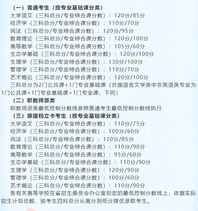 补录,也得过补录分数线,补录看三科总分,三科总分需要满足以下最低控制分数线才能参与。
