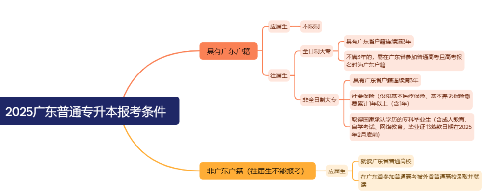 以下是2025年广东专插本报考条件主要看户籍、是否应届生、社保、学历这几个方面:
