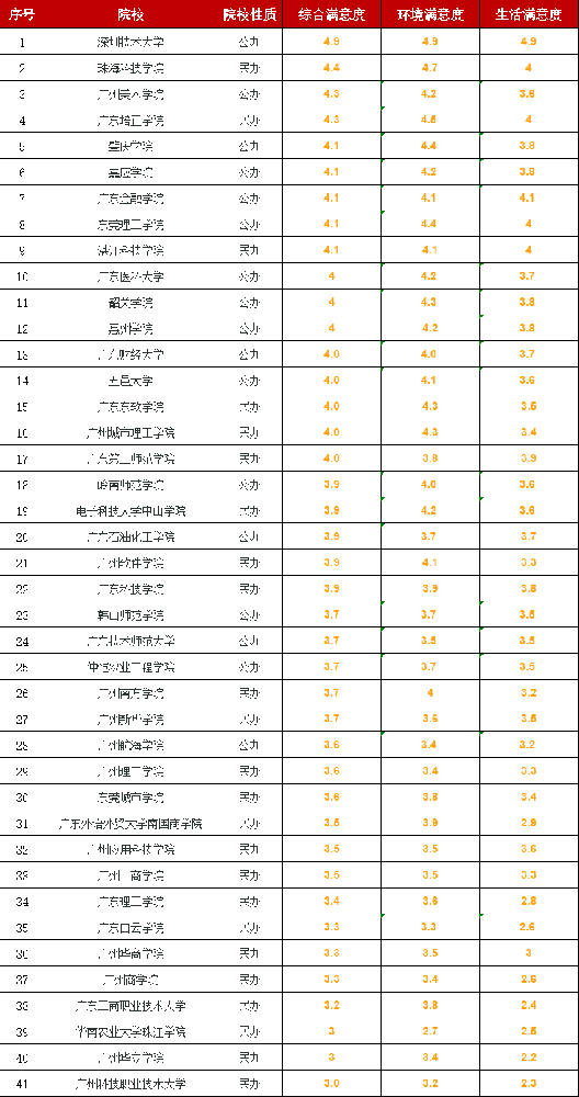 广东各个院校的排序,是依据三项平均满意度并结合投票人数进行排序的(满意度总分为5)。