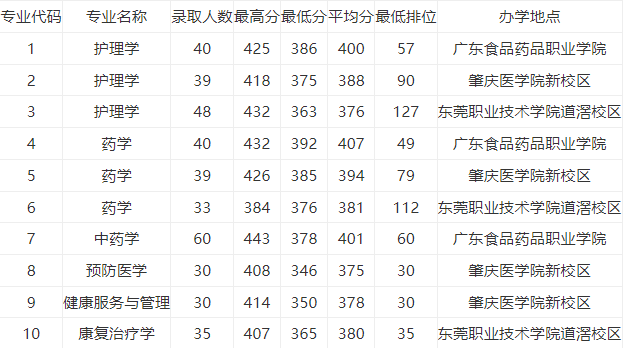 办学地点中的广东食品药品职业学院的专业(1、4、7代指专业代码),最低位次相对靠前(49、57、60 ),说明报考热度较高,竞争相对激烈;肇庆医学院新校区的专业(2、5、8、9 ),最低位次有 30、79、90 等,不同专业报考竞争度不同;东莞职业技术学院道滘校区的专业(3、6、10 ),最低位次 35、112、127 ,整体竞争程度在三者中相对没那么突出。