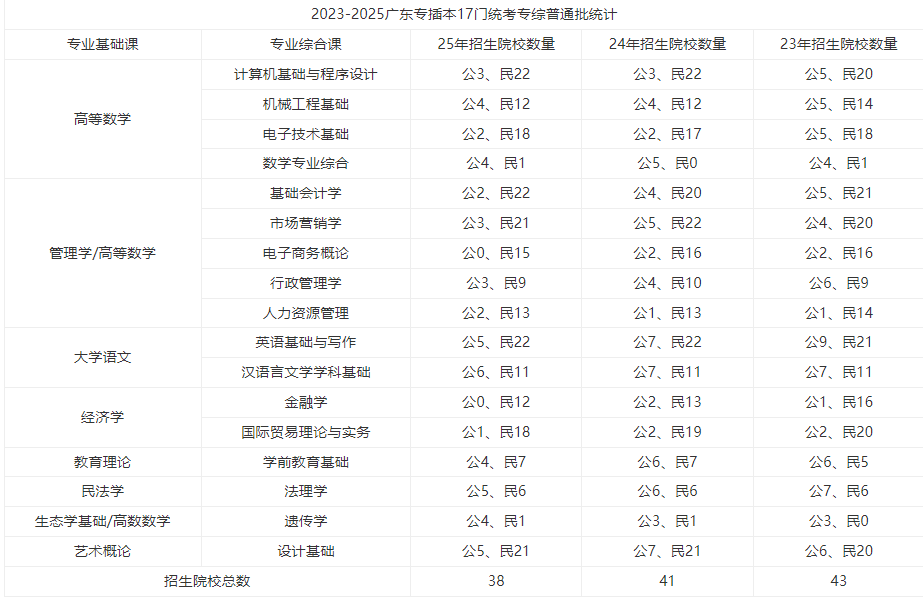 2025年广东普通专升本一共17门统考专业综合课,按专业综合课给这17门专业进行分类,下面对比了2023-2025年专插本对应的公办民办招生院校数量情况,可以看出一些招生趋势: