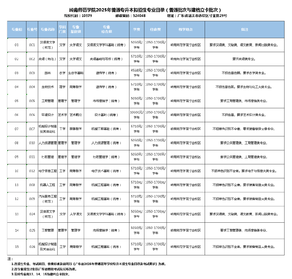 广东专升本为备考广东专升本的学子整理了岭南师范学院招生专业目录、教学地点、学宿费及前置专业要求,更多详细内容见下。