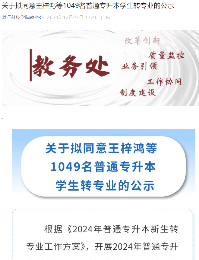 湛江科技学院从2021-2024年都对专升本考生开放了转专业,从2024年公布的数据看,湛江科技学院进行转专业的考生有1049名(当年总计划5200),这个转专业数据比想象的多很多。