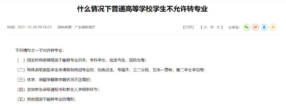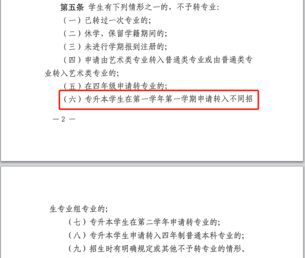 查看各院校的《转专业管理规定》,统计出目前绝大部分院校都是按照省教育厅规定执行:专升本不允许转专业。