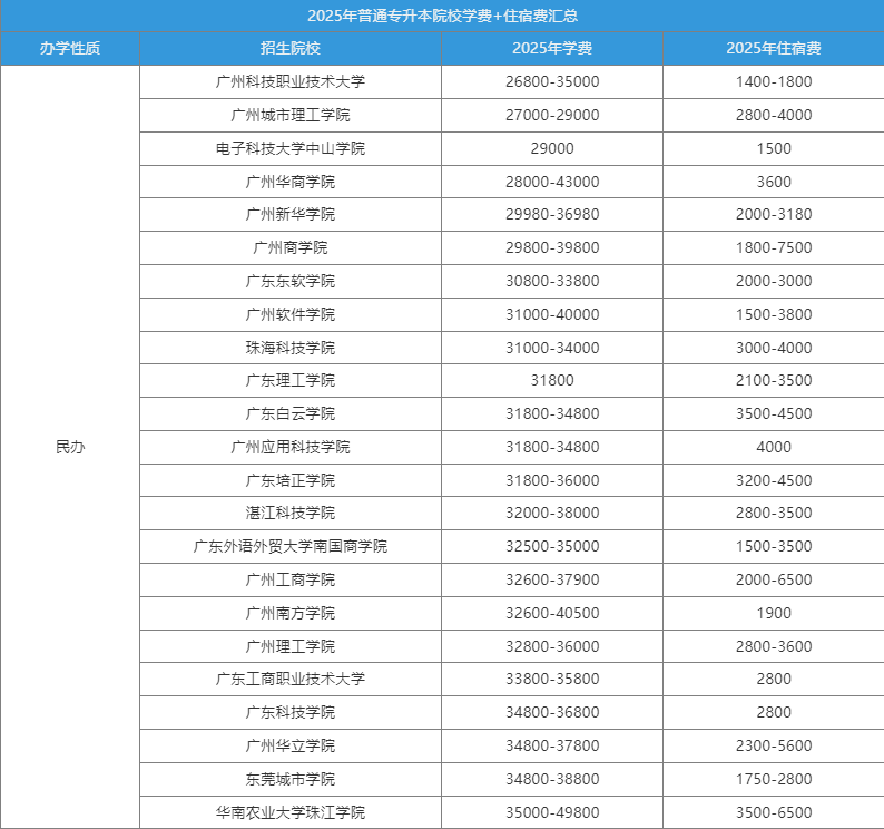 民办院校排名前五的分别是:华南农业大学珠江学院、广州华立学院、广东工商职业技术大学、广州商学院、广南方学院。基本上读完两年下来,可能要花差不多10万块的学费。对于大部分学生家庭来说,负担还是比较重的!