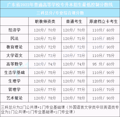 普通专升本招生由省招生委员会办公室根据年度普通专升本招生计划和考生成绩情况,按考生类别(职教师资、建档立卡考生、普通考生)、专业基础课分别划定三科总分(2门公共课+1门专业基础课,外国语言文学类中非英语类专业为1门公共课+1门专业基础课+1门专业课,下同)和专业综合课两条最低控制分数线。